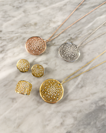 中心に向かって立体的に重なるモチーフが、デコルテを美しく彩ります。